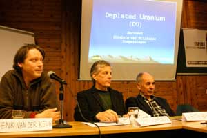 Na de presentaties was er een discussie met de zaal, die soms in het Engels en soms in het Nederlands was.Hier is het verslag, met vragen over onder meer de legaliteit van uraniumwapens, besmetting van grond, mogelijkheid dat deeltjes meegevoerd door de wind grote afstanden afleggen en informatie over de inzet van uraniumwapens.